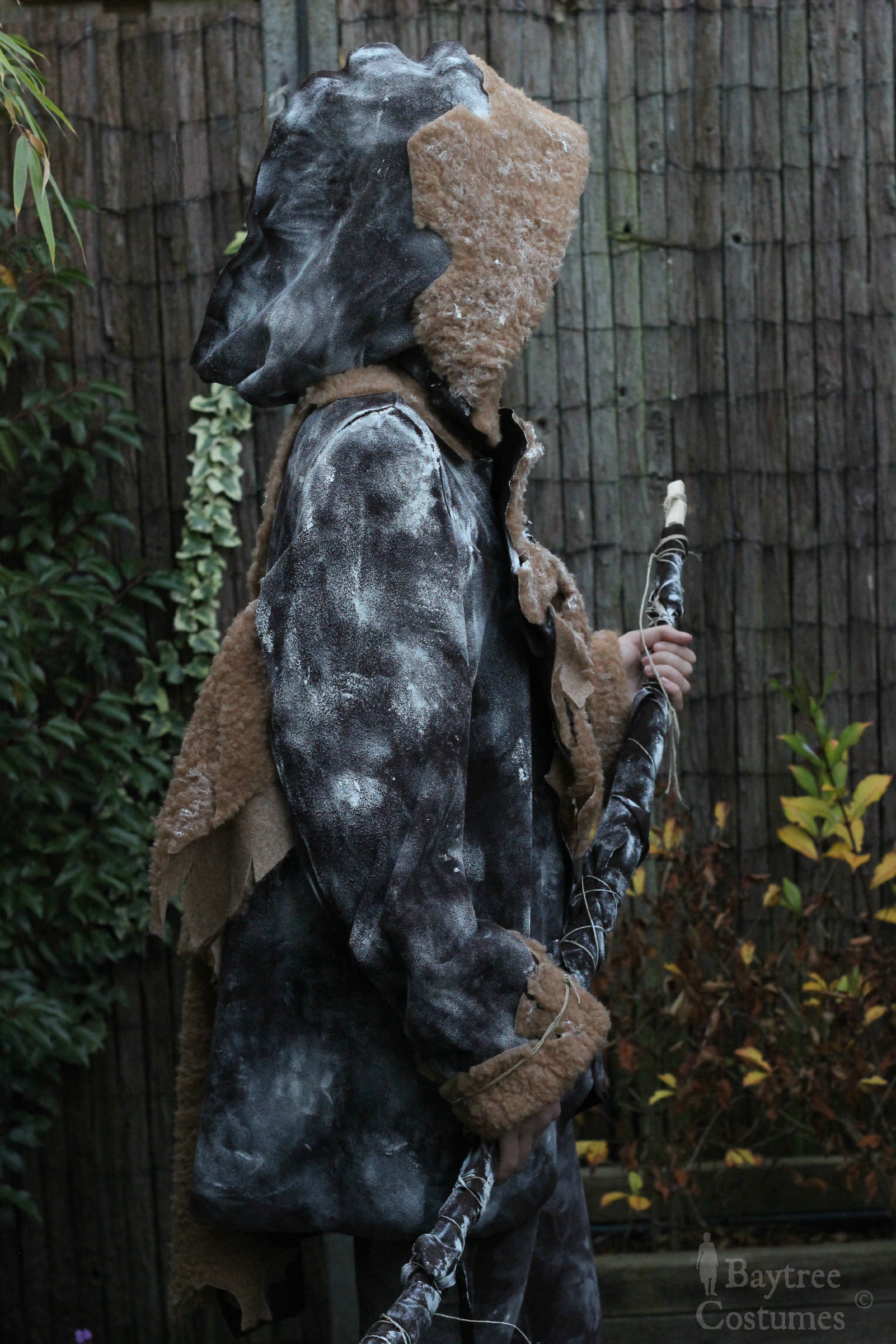 FAQ Why brown? Ygritte’s costume is grey! ~ You are absolutely right of course. BUT: underneath that grey you can see spots of brown coming out to the surface. The white lies as a translucent layer over the brown undertone. Thus, the suede had to be brown to after that be covered with white (paint).